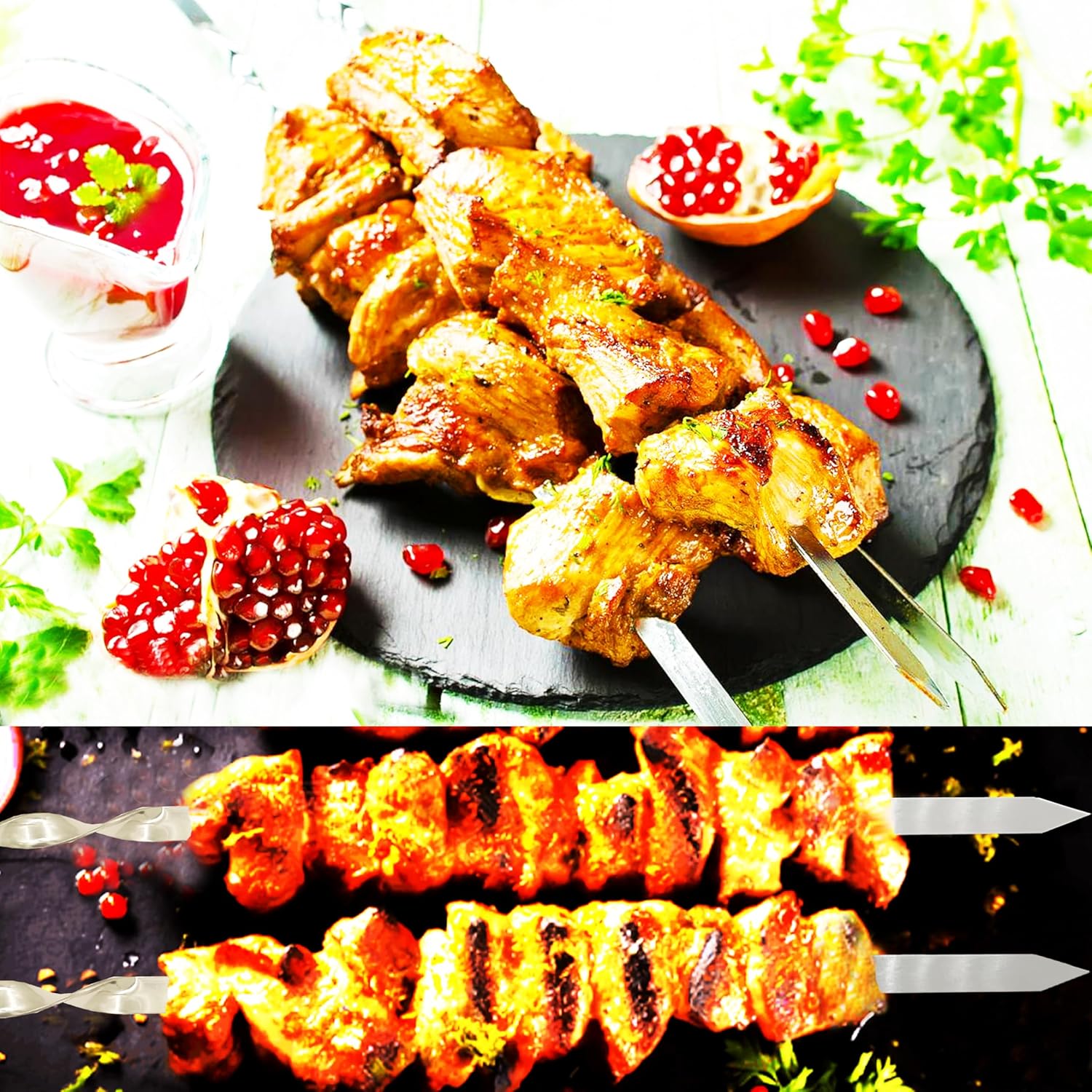 - 【PRECAUTIONS】Stainless steel skewers are very sharp.Becareful when using,Surface of the kebab skewers is well polished and smooth,Just wash them with gentle detergent immediately after used,wipe away the water and keep in dry place with the storage bag after used.