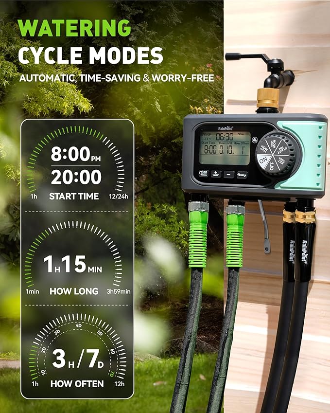 - 3 TIMED WATERING CYCLE MODES - This 4 zone water timer for garden hose can be flexibly set start time in 12-hour or 24-hour format, watering duration from 1-3 hours 59 minutes, and watering frequency in every 8 hours, every 12 hours, or every 1~7 days. Don't worry about no one watering plants anymore, travel with confidence.