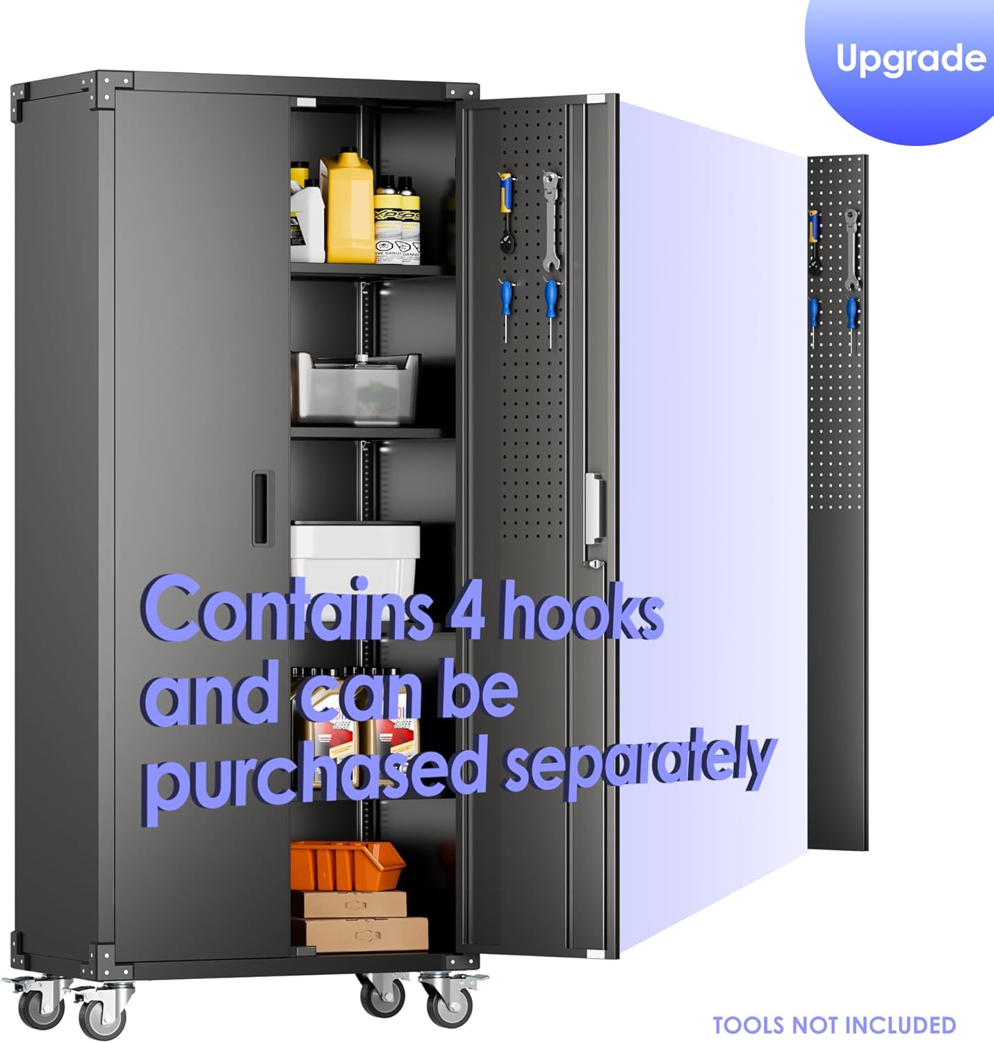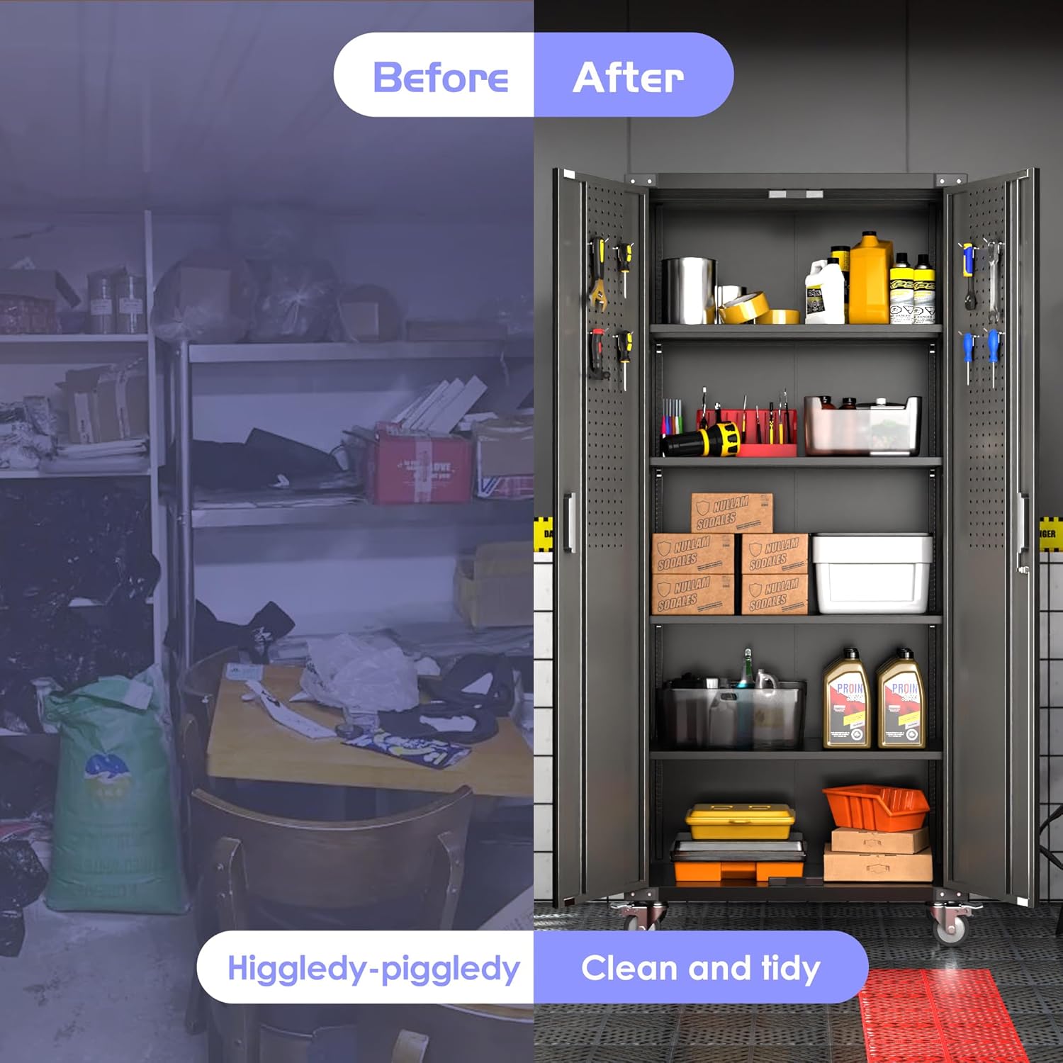 - 【Utility Pegboard & Adjustable Shelves 】Redesign your organizing ways, hang up everything on the door, get effortless accessible for a variety of small hardware, no more searching for things among the clutter. Tall Garage storage cabinet with wheels is designed with 4 adjustable shelves, you can easily meet your different storage needs by adjusting the height between the shelves.