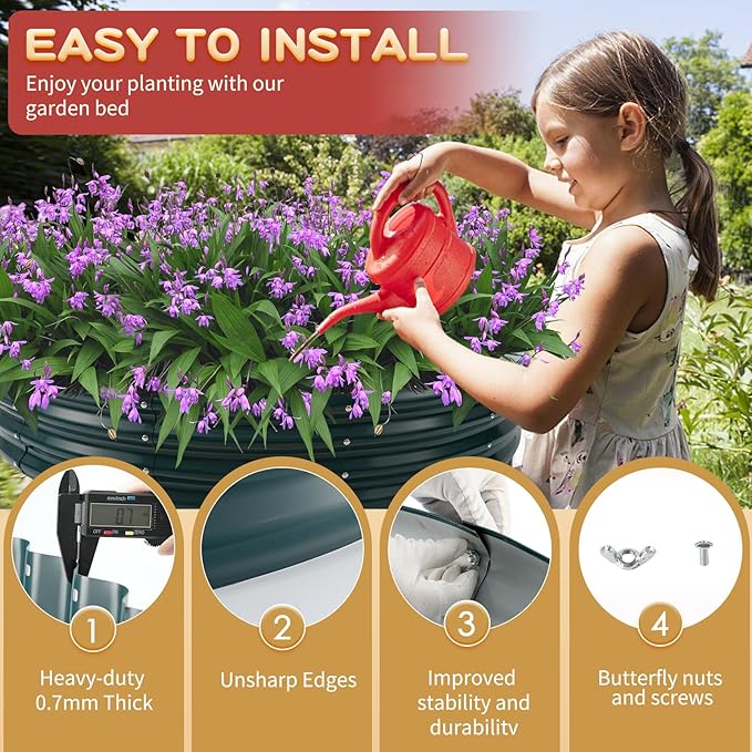 - 【EASY ASSEMBLY】: This painted steel raised garden bed only takes about 5 minutes to assemble easily,a screwdriver and a pair of gloves are need,which are prepared in the package already.