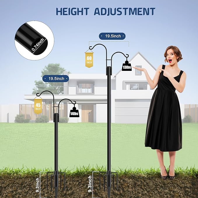 - Versatile & Multi-Purpose: Built with a sturdy frame and double-arm design, our outdoor shepherd's hook is ideal for hanging solar lanterns, flower baskets, plant pots, hummingbird feeders, wind chimes, and more. As shepherds hooks for outdoor, it adds charm and functionality to any outdoor space, making it the perfect accessory for gardens, patios, or backyards.