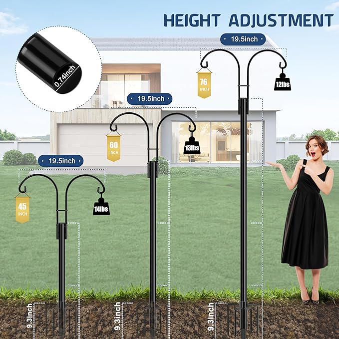 - Versatile & Multi-Purpose: Built with a sturdy frame and double-arm design, our outdoor shepherd's hook is ideal for hanging solar lanterns, flower baskets, plant pots, hummingbird feeders, wind chimes, and more. As shepherds hooks for outdoor, it adds charm and functionality to any outdoor space, making it the perfect accessory for gardens, patios, or backyards.