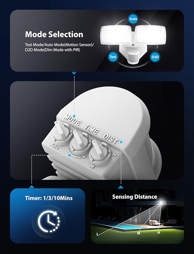 - Dusk to Dawn Mode: Equipped with the Dusk to Dawn function, this motion flood lights outdoor automatically turn off during the day and operate at 30% brightness at night. When motion is detected, they instantly brighten to 100%, ensuring energy efficiency and enhanced security.