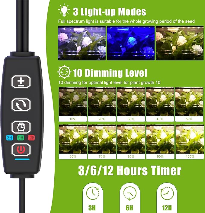 - 【10 Levels Brightness & Timer Setting】 This seed starter tray with grow light offers 10 brightness levels and a 3/6/12-hour timer, providing precise light intensity and duration to ensure your plants get the perfect conditions for healthy growth.