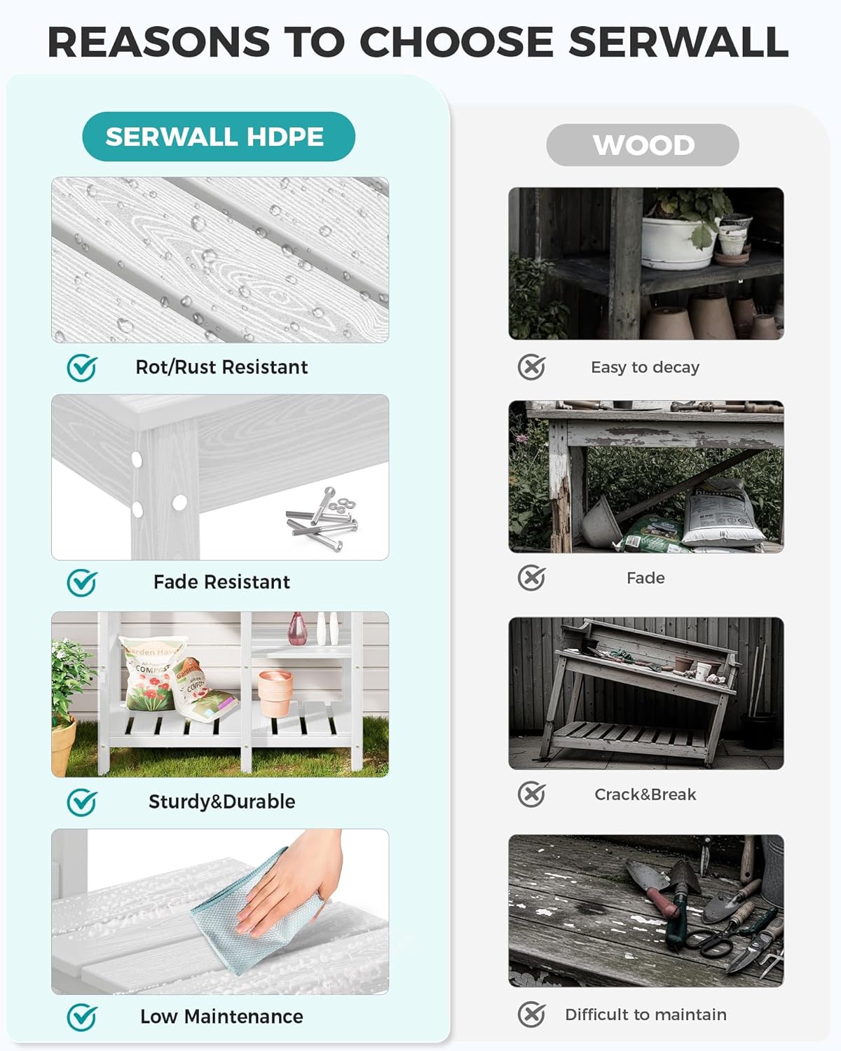 - HDPE Material: Constructed from 100% HDPE material, the SERWALL outdoor potting bench offers high strength and stability, ensuring a long service life. Potting bench table is durable for outdoor use in any weather condition.