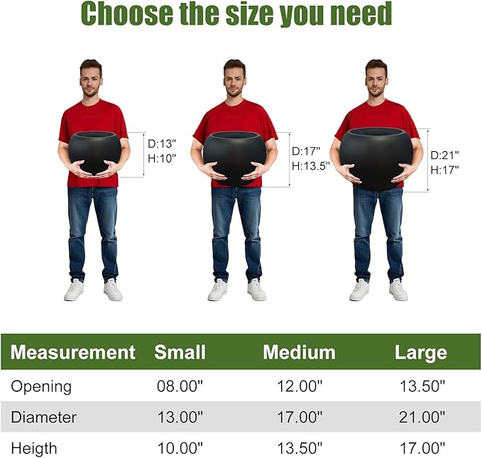 13.5 H x 17" Dia (12" Pot Opening) Round Fiberstone Planter with Drainage Hole, Black, Indoor/Outdoor Large Plant Pot for Home Patio Garden, Ideal for Large Plants