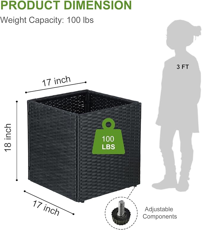 - Removable Liner: Each wicker planter in this set comes with a nonwoven fabric liner (measures 16 x 16 x 17 inch) that separates wicker from the soil. Keep planter in excellent condition to prevent weeds and other invasive species from interfering with plant growth
