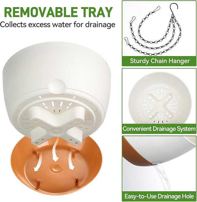 - 【Watering Made Easy】 Our hanging plant pots feature a built-in drainage system and a water reservoir tray that stores enough water for 7-14 days, preventing root rot and ensuring proper hydration. Ideal for busy schedules or travel, offering hassle-free plant care.
