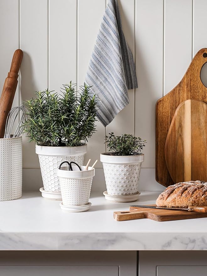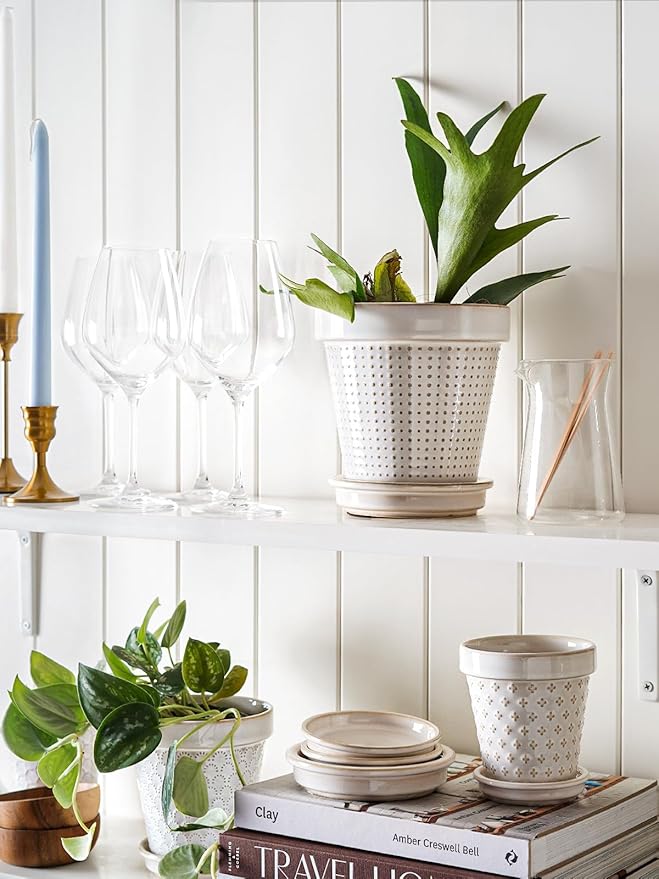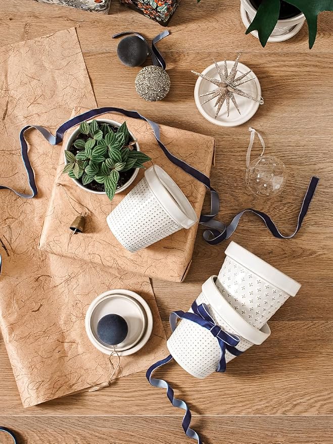- Decor Living Space: Discover a cute embossed design ceramic pots โ5.9 inches in diameter and 4.7 inches top opening, good for small and medium sized plants and flowers such as succulents, African violet, vanilla, basil, etc. These ceramic flower pots add a touch of green to tables, windowsills, balconies, or bookshelves. Arctic white glaze, coupled with a light brown pattern, the delicate balance of embossed design and botanical vitality converges, creating an atmosphere of unparalleled grace and visual delight