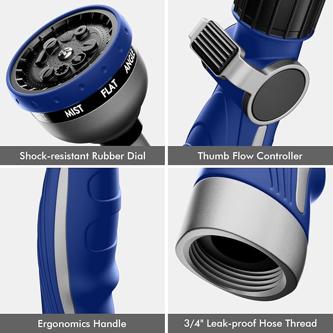 - 【Thumb Control Hose Sprayer】Simply and effortlessly spray water with the thumb flow control. Adds more convenience when you switch the watering between on & off, or high & low pressure. The anti-slip rubber is built in the metal flow controller, which can provide hassle-free thumb push and pull. A reliable & functional tool when you need to water your garden, lawn, grass, plants, and flower beds.