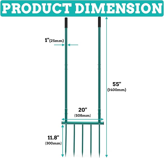 - Premium Material and Reinforced Design: Made from all-steel materials with a thickened structure, this hand tiller broadfork features an additional green coating that effectively prevents rust and corrosion, ensuring superior durability compared to wooden tools which are prone to rotting and breaking. Its sturdy design handles demanding tasks and challenging soil conditions. Featuring five rounded tines, it minimizes soil adhesion for extended use and is perfect for all your gardening needs