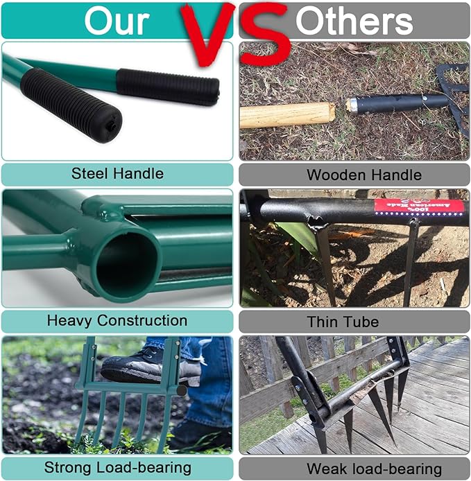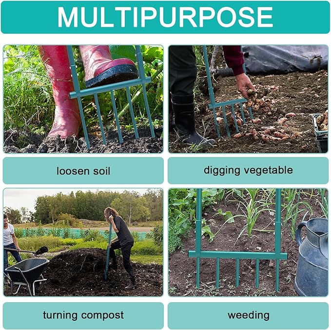 - Easy to Operate: Our 5-tine heavy-duty pitchfork is beginner-friendly. Simply assemble, step the tines into the ground, and press down to break up the soil. Compared to traditional hoes and shovels, our broadfork is more labor-saving. Unlike noisy gas-powered machines, it offers a quieter, eco-friendly alternative, requiring no electricity—making it portable and perfect for use anywhere. Its gentle design protects beneficial creatures like earthworms, preserving soil health and the ecosystem