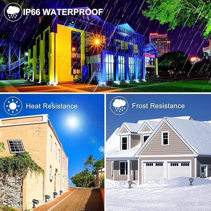 - Sturdy & IP66 Waterproof Garden Solar Light: IP66 waterproof can withstand rainy days, perfect as an outdoor light solar powered. The weatherproof housing keeps the solar rgb landscape spotlights protected from moisture and dust, stable and long-lasting. High temperature resistance and cold resistance -25 ยฐC - 55 ยฐC