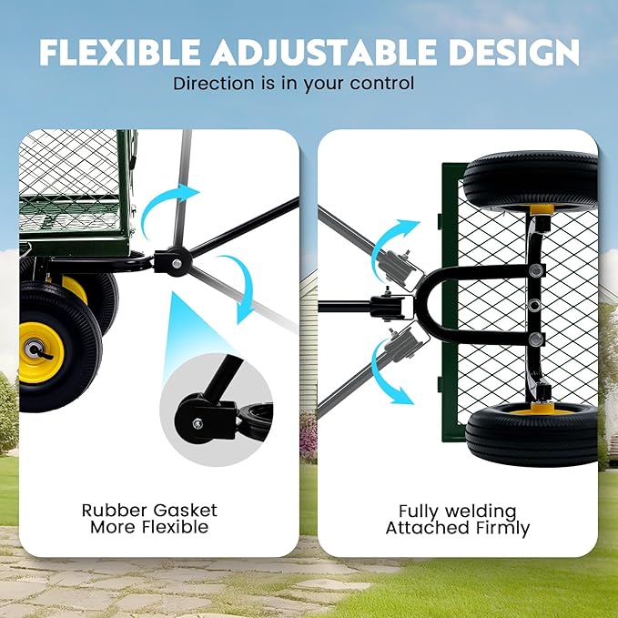 - 【240° U-TURN DESIGN】 The yard wagon cart allows for a smooth and flexible 240° U-turn, making it effortless to turn around even in tight spaces. The handles have a 180° turn design, so you can haul the cart in any direction freely and conveniently as you need; Its ergonomic design is comfortable for you to pull goods in an elegant way.