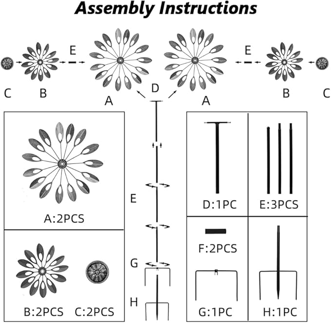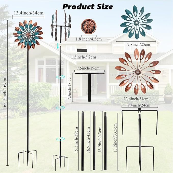 - Easy to Assemble: Our wind spinners for yard come in three simple parts: the blades, the poles, and the stable stake. Each part can be easily put together following the instructions, and no tools are required. Just stick it into soft ground and enjoy it