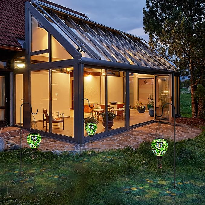 - Solar Lanterns: Outdoor solar lanterns absorb sunlight during the day and are automatically lit at night, providing 6-8 hours of illumination. The soft warm light of the hanging solar lantern creates a romantic and peaceful atmosphere for the outdoor space.