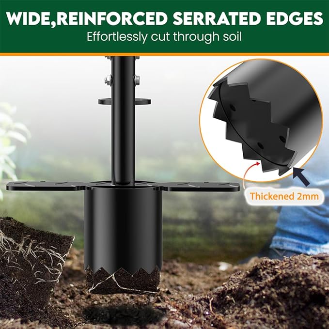 - [ Sturdy Construction ] Unlike flimsy tools, our bulb planter features a 3.5-inch wide serrated base, 2mm thick, with sharp, reinforced serrated edges that prevent bending or deformation, ensuring exceptional durability