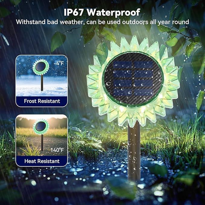 - Rotatable Solar Panel & Long-Lasting Battery: Solar sunflowers lights equipped 180ยฐ adjustment upgraded larger solar panel with higher conversion rates and optimal absorption of sunlight, with 1000mAh rechargeable battery for charging in 4-6 hours and providing 8-10 hours of illumination.Decorate with solar garden stake light, you can enjoy your beautiful garden/courtyards all night long