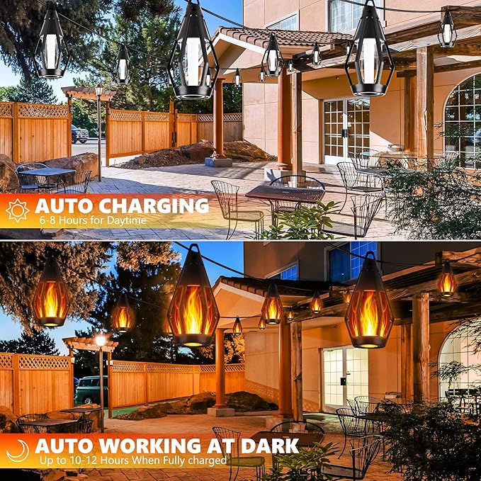 - Warm White Flame Design: Create a cozy atmosphere with our solar-powered flame string lights, perfect for enhancing the ambiance of your garden, patio, or outdoor events.