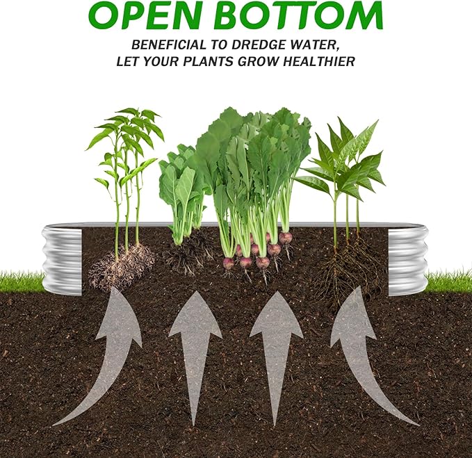 - 【Open Bottom】This metal raised garden bed is designed with an open base. It is good for drainage, and plants roots won't be sick from excessive water. Also, it can absorb better nutrition from the soil, and grow healthier.