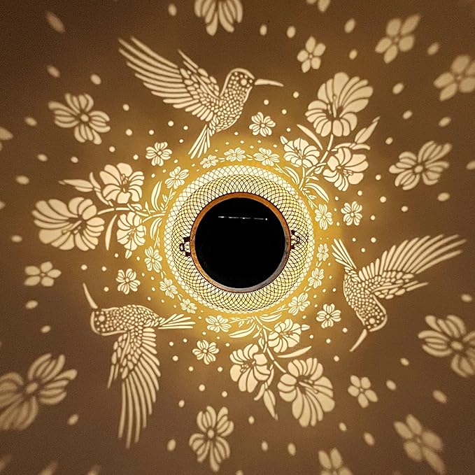 - Graceful Decorative Design - The retro appearance, with gold copper color and hollow out metal veneer, the solar outdoor lanterns casts bright and warm light in darkness, accompanied by gorgeous and graceful hummingbirds patterns, adding a beautiful atmosphere to the surrounding environment.