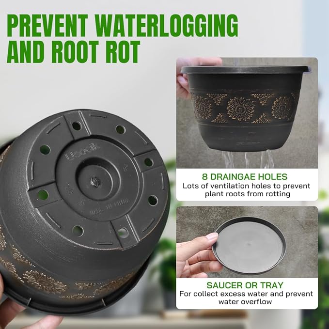 - DRAINAGE HOLE WITH SAUCER โ Each garden pot has drainage holes and a saucer. The holes of these plant pots helps protect plants from excess watering. The saucer help to collect excess water and prevent water flowing, keeping the floor dry and clean.