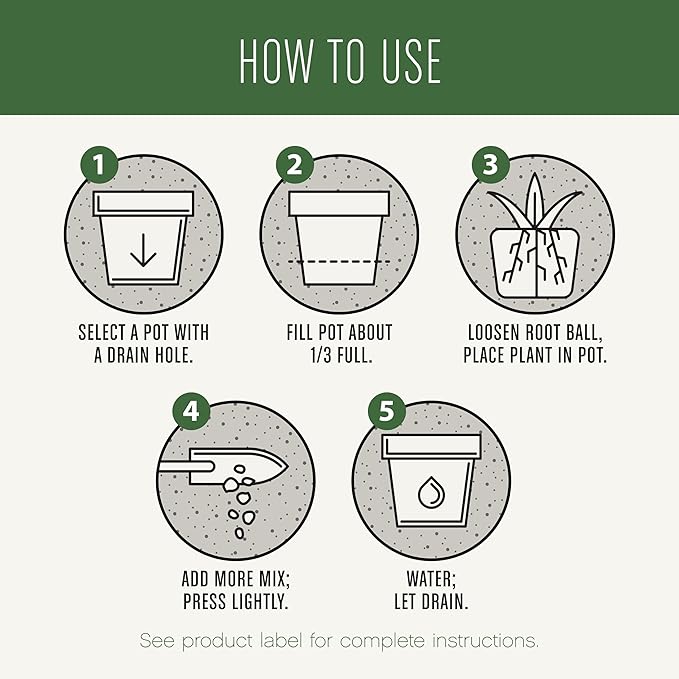 - To use: fill your pot 1/3 full with mix, add plant, cover root ball with more mix, press lightly around stem, water, and let drain