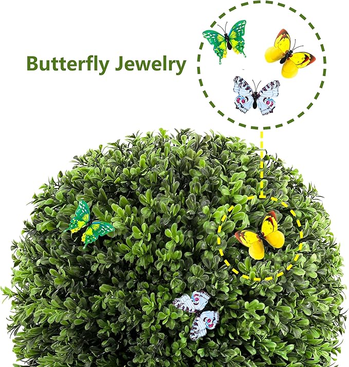 - 【90-Second Setup & Versatile Styling】 Pre-assembled structure with bendable vines and embedded ground spike allows instant installation in soil, pots, or rocky terrain. Rotate 360° to showcase fake butterfly ornaments from every angle – Our evergreen faux boxwood balls is perfect for photo-ready porch décor or events
