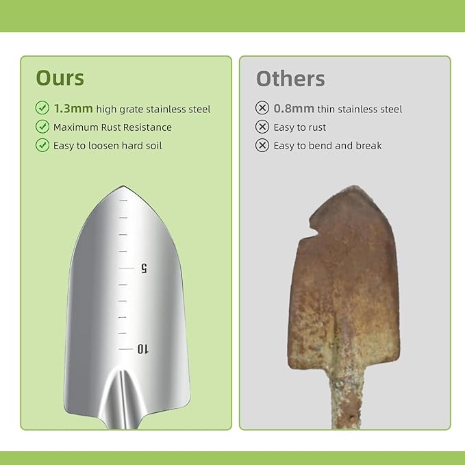 - Premium Garden Set: These gardening tools are made of high-strength stainless steel, guaranteeing corrosion resistance and rustproof for incredibly tough, sharp, and sturdy that will last a long time.