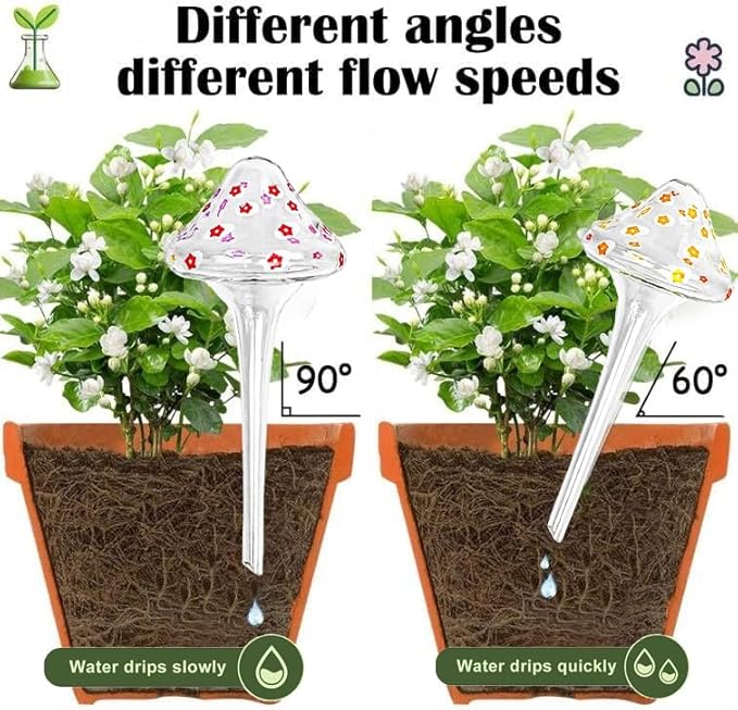 - Decorative and Functional Design: These mushroom-shaped watering globes are crafted from hand-blown glass with vibrant, unique colors. They double as eye-catching decor, perfect for indoor plants, outdoor pots, hanging baskets, and patio gardens.
