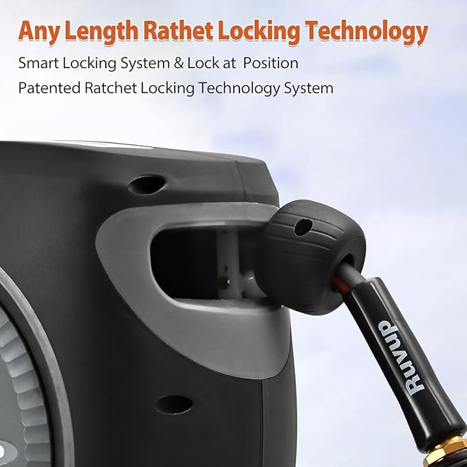 - Smart Locking System: The Ruvup wall mounted hose reel is designed for convenience and ease of use. The garden hose reel lock and auto rewind system ensures secure, stability and lock the hose reel in any position effortlessly, eliminating the need to wrestle with tangled hoses or kinks.