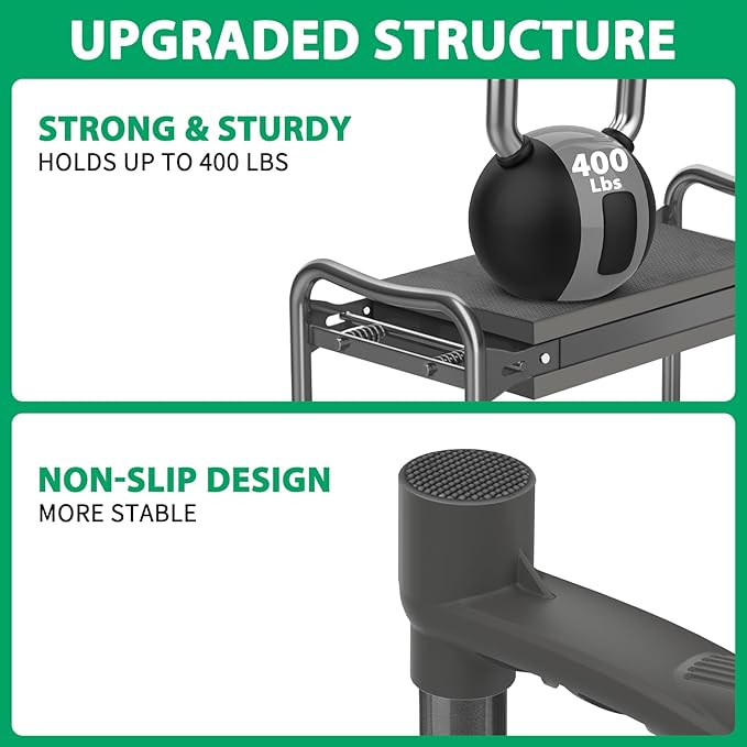 - 【MULTIFUCTIONAL GARDEN TOOLS】It is a versatile garden tool: you can use it as garden kneeler, knee on the soft kneeling pad, and it have raised handles to help get up and get down while gardening. Also, you can flip it over and use it as garden seat. The non-slip designed feet makes it more steady while sitting.