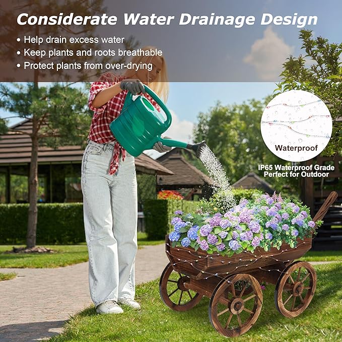 - 【LONG-LASTING】: Made of high quality fir wood, this wagon planter ensures long-lasting use while complementing your outdoor space. In addition, the hub has iron reinforcement for long-lasting use.
