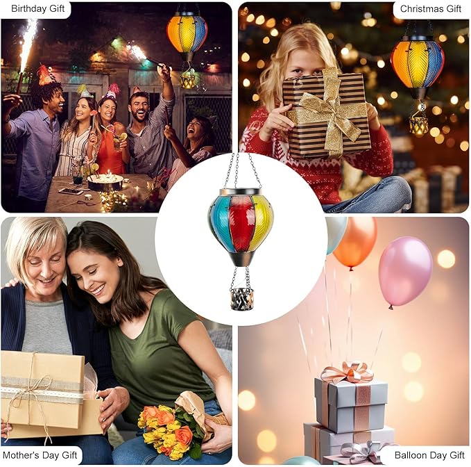 - 【Wide Application】-- Hot air balloon lantern with a chain hook, you can hang the solar light on porches, trees, pergolas, balconies, or ledge. Add elegance and color to your outdoor space with this beautifully crafted solar-powered lantern. Perfect gift for your friends and family.