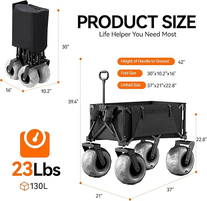 - All-Terrain Mastery | Sand/Grass/Gravel Ready: 10-inch extra-wide puncture-proof tires + dual ball bearings, effortlessly conquer sand, rocks, and mud (supports 300lbs, 20% more than competitors).