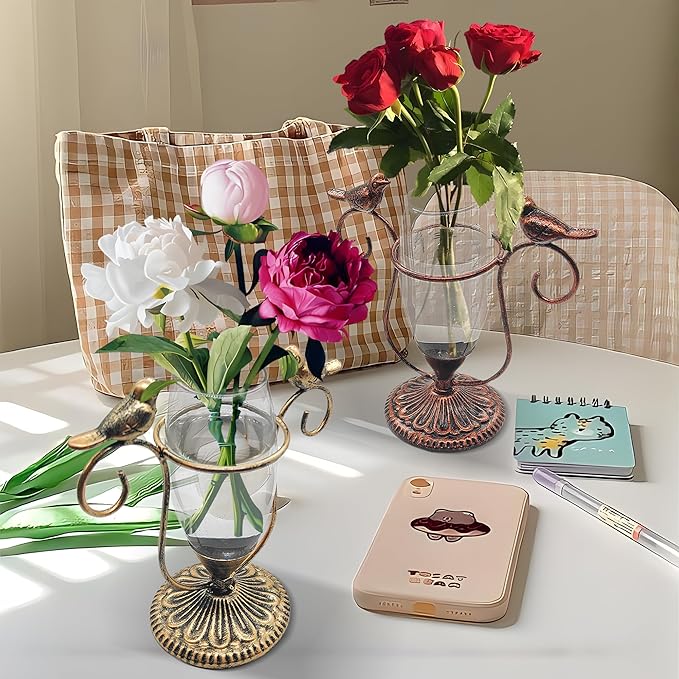 - [Unique Design] These two exquisite plant glass containers are designed with reference to the shape of retro wine glasses, decorated with two metal iron birds, painted with hand-painted bronze paint and golden copper paint respectively. They are retro, versatile, elegant and unique.
