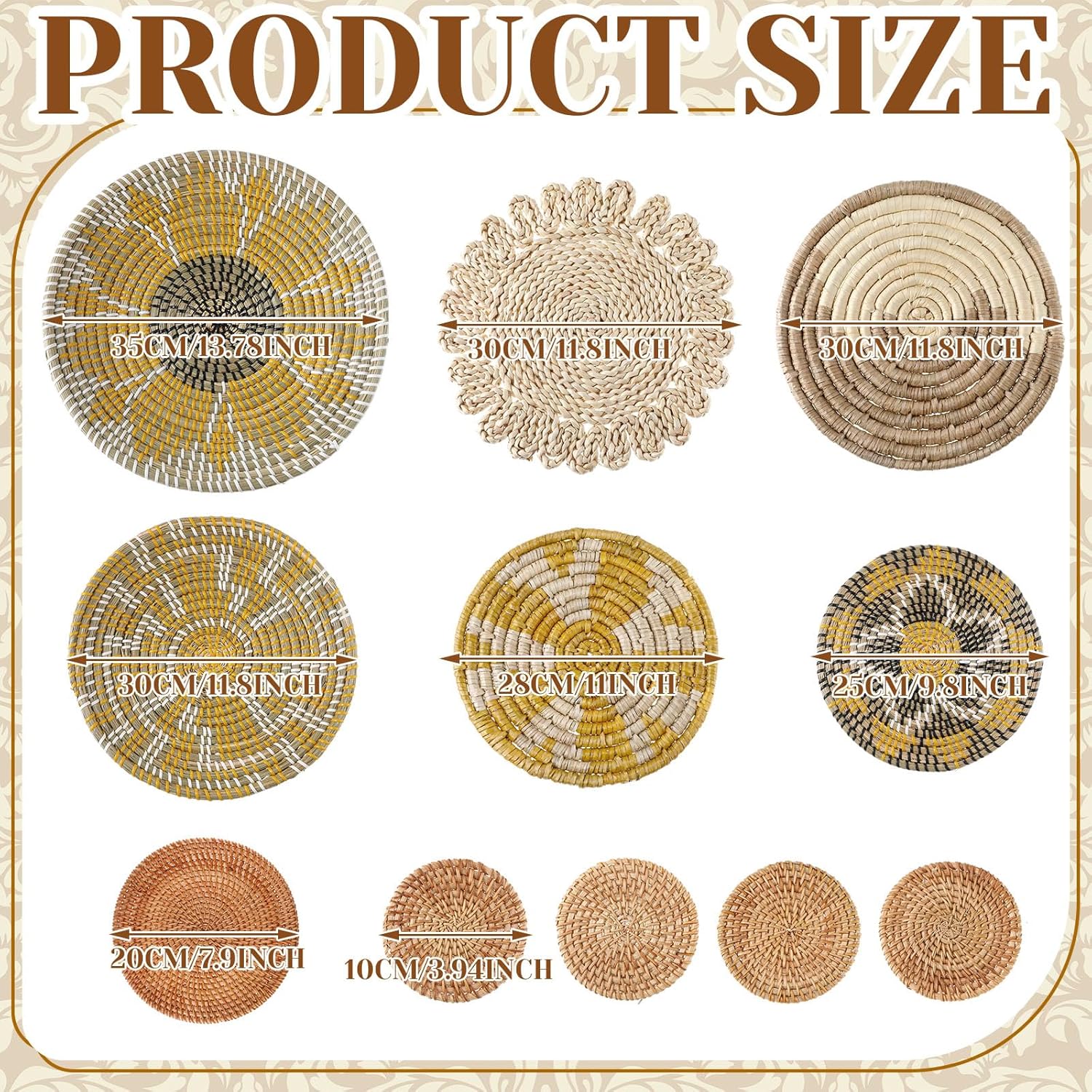 - Wide Range of Applications: boho basket wall decor set as placemats, or as decorative baskets to store toys and accessories, the rustic basket wall art is suitable for many occasions, such as hotels, restaurants, living rooms, bedrooms, schools, stores, offices, dorms, shops, spring, summer and more, bringing you an elegant and classic feeling