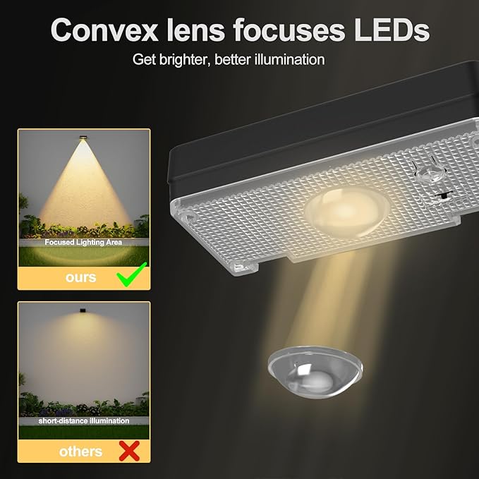 - 【High Efficiency & Energy Saving】The fence lights solar powered feature upgraded focused LEDs and advanced reflective lens technology,brightness with a more concentrated beam that covers a wider area. We advocate a green life, solar lights outdoor can reduce your household electricity bill, high-efficiency photovoltaic panels will be sunlight into electricity efficiency increased by 20%, both energy-saving and environmentally friendly