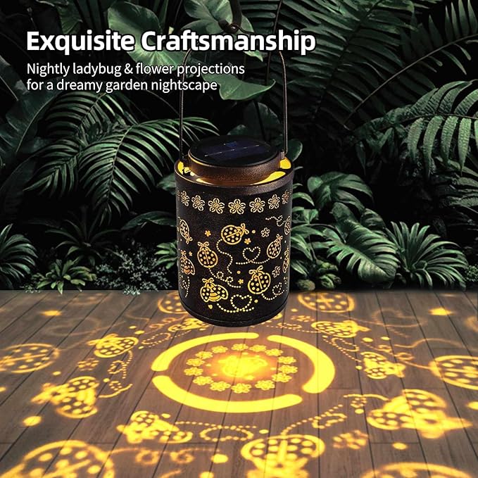 - Adorable Ladybug Design: This charming solar lantern features a playful ladybug pattern, beautifully designed with a vintage copper finish. When lit, it casts radiant and magical projections, adding a fun touch to your garden or patio