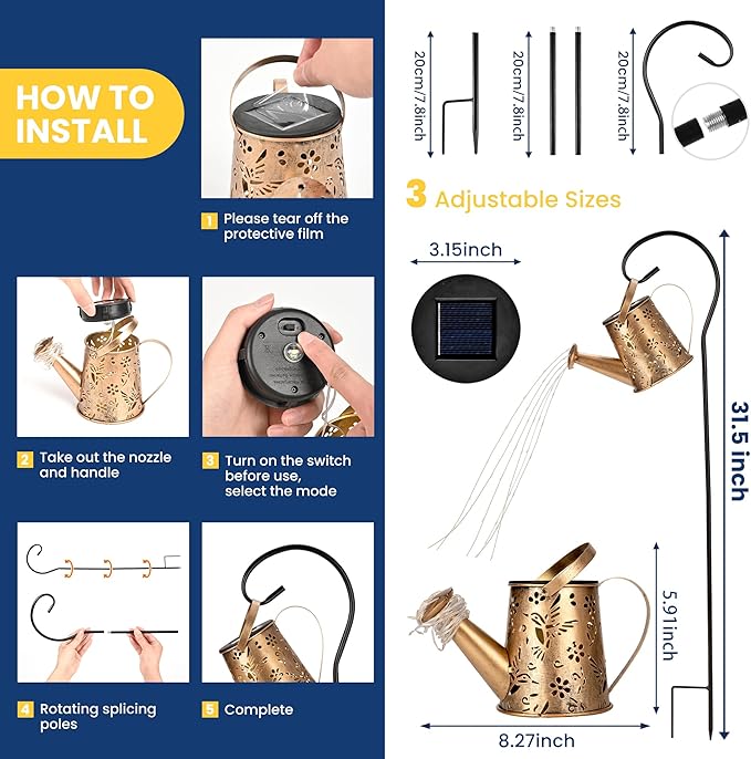 - Dimensions and Specifications: The solar garden light is made of durable metal, including the watering can body, spout, and handle. It comes with a ground stake composed of five 7.8-inch sections, allowing you to customize the height as needed