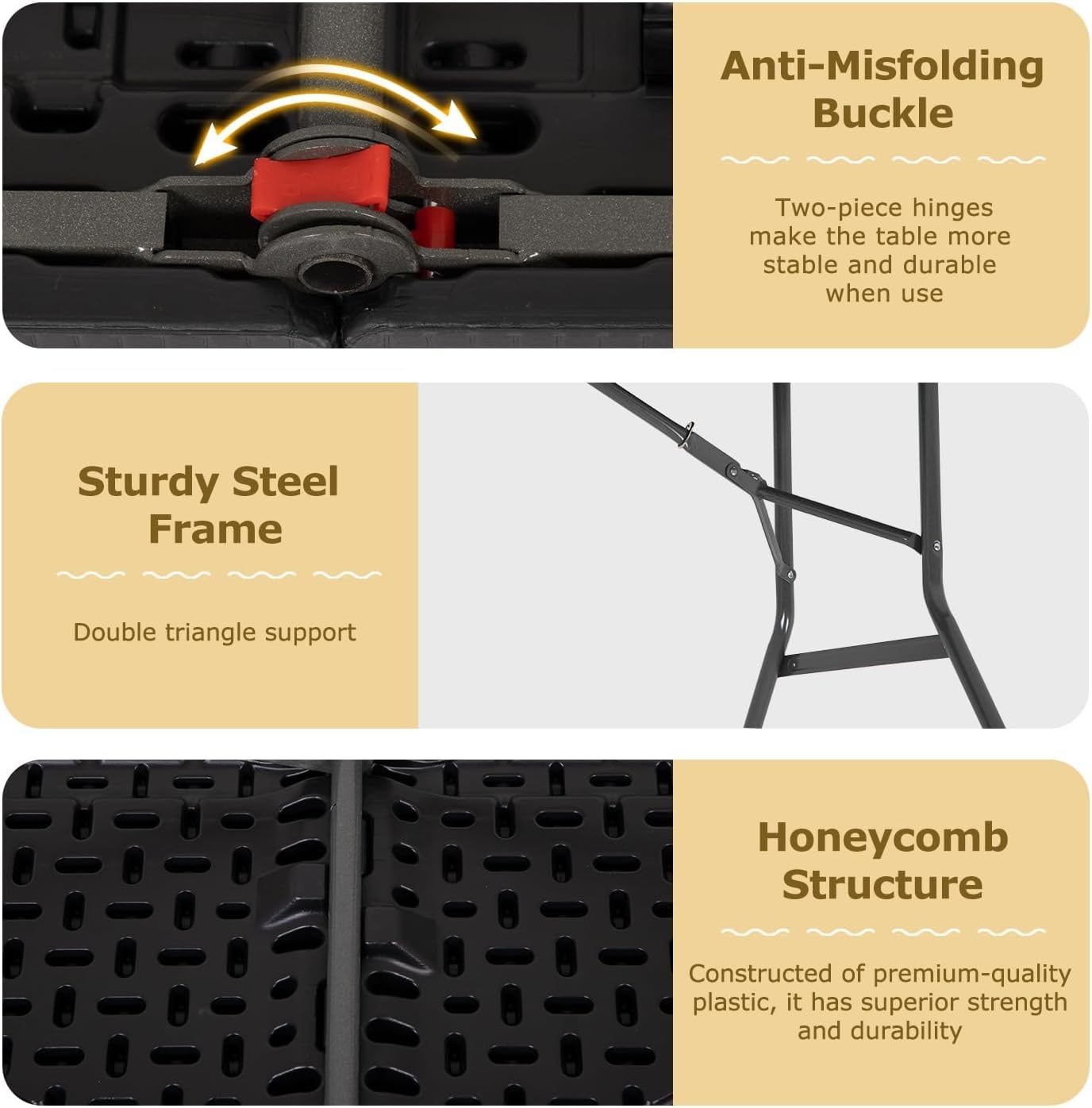 - 【Foldable】This 6ft picnic folding table can be folded in the middle and fastened with a safety catch for easy storage. You can put the folding table away in the trunk of your car, or in a small corner, and easily pick it up when you need it. camping tables that fold up lightweight.