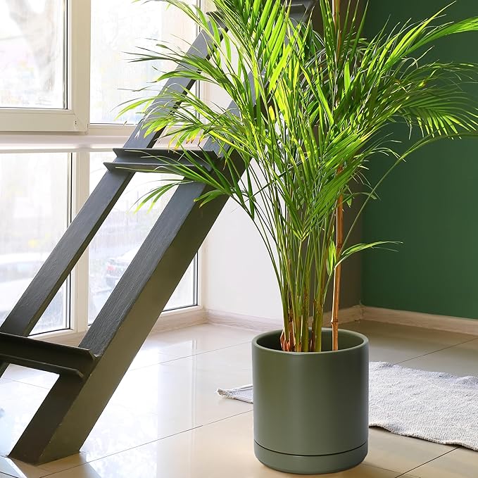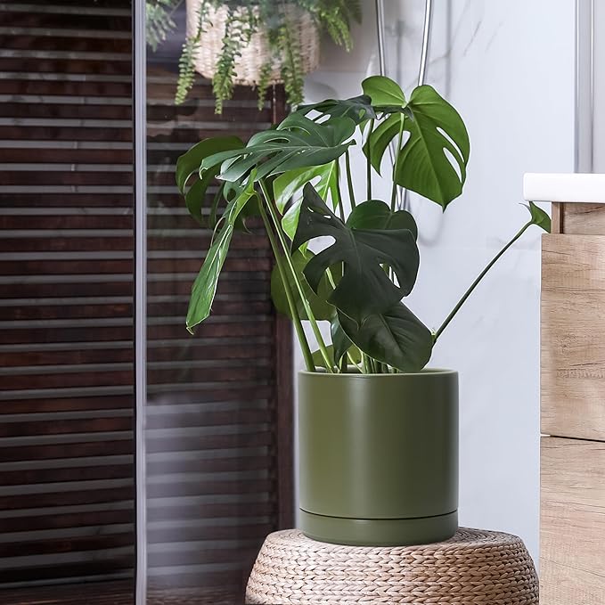 D'vine Dev 10 Inch Ceramic Planter Pot with Drainage Hole and Saucer, Indoor Cylinder Round Planter Pot, Olive, 94-O-E-J