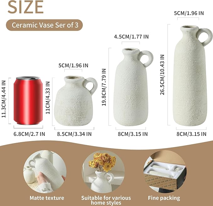 - 【For Multiple Home Décor Styles】Designed in a variety of shapes and sizes, this rustic vases set is a perfect home décor even without flowers. Whether your style is bohemian, modern farmhouse, rustic, or homey, they all fit in perfectly show off your lifestyle and decorative sense of style. (Length X Diameter=10.43X3.15", 7.79X3.15",4.33X3.34").