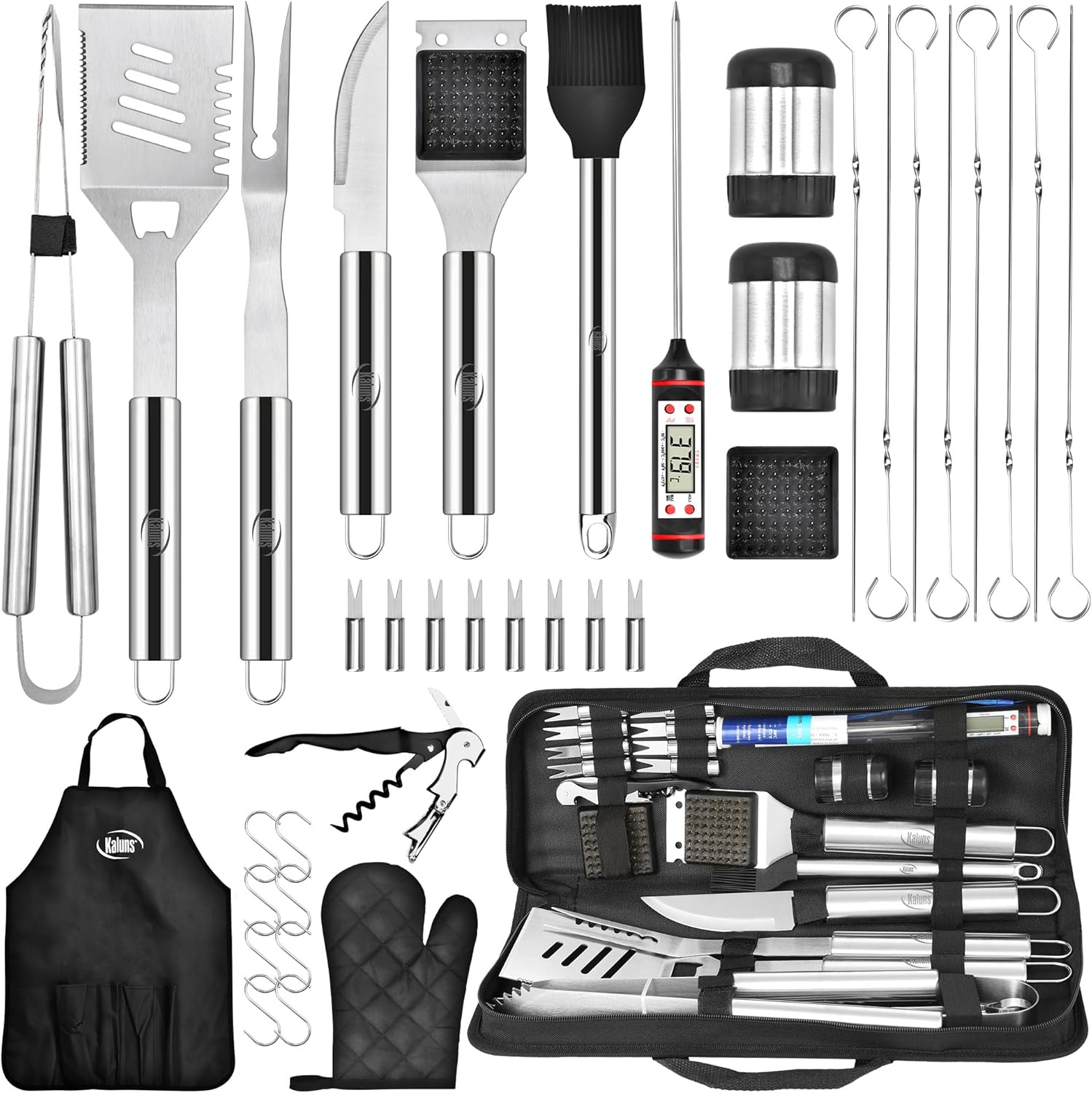 Kaluns Grilling Accessories, Dad Gifts for Christmas Grilling Gifts, Heavy Duty Stainless Steel Grill Set BBQ Grill Accessories for Outdoor Grill with Meat Thermometer, Case and Apron