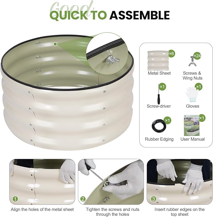 G GOOD GAIN Round Raised Garden Bed - 3Pcs 2x2x1ft Galvanized Steel Planter Boxes Outdoor with Rubber Edge Trim | Metal Raised Beds for Gardening Vegetables Flowers Fruits Herbs (White)