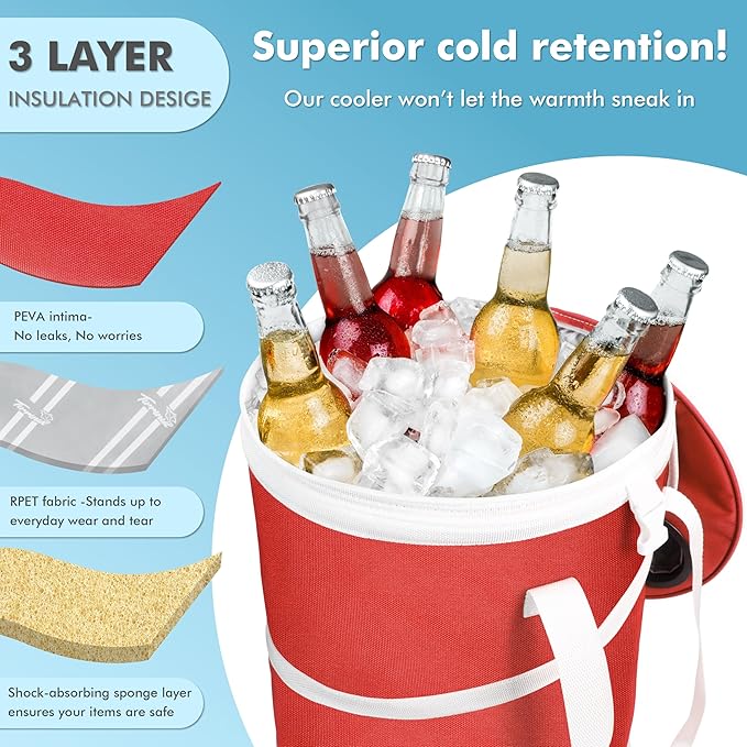 - Insulation&Leakproof: Ensure your drinks stay cold and safe with our collapsible cooler. Featuring a durable, heat-welded liner, this travel beer cooler prevents leaks, so you can store ice and beverages with confidence. The sturdy outer shell also resists light rain, making it one of the most dependable coolers for picnic, fish.