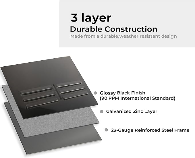- Sturdy All-Steel Construction: Made from thick galvanized steel with a glossy black finish for both modern appeal and long-lasting durability. Built to withstand indoor and outdoor environments.