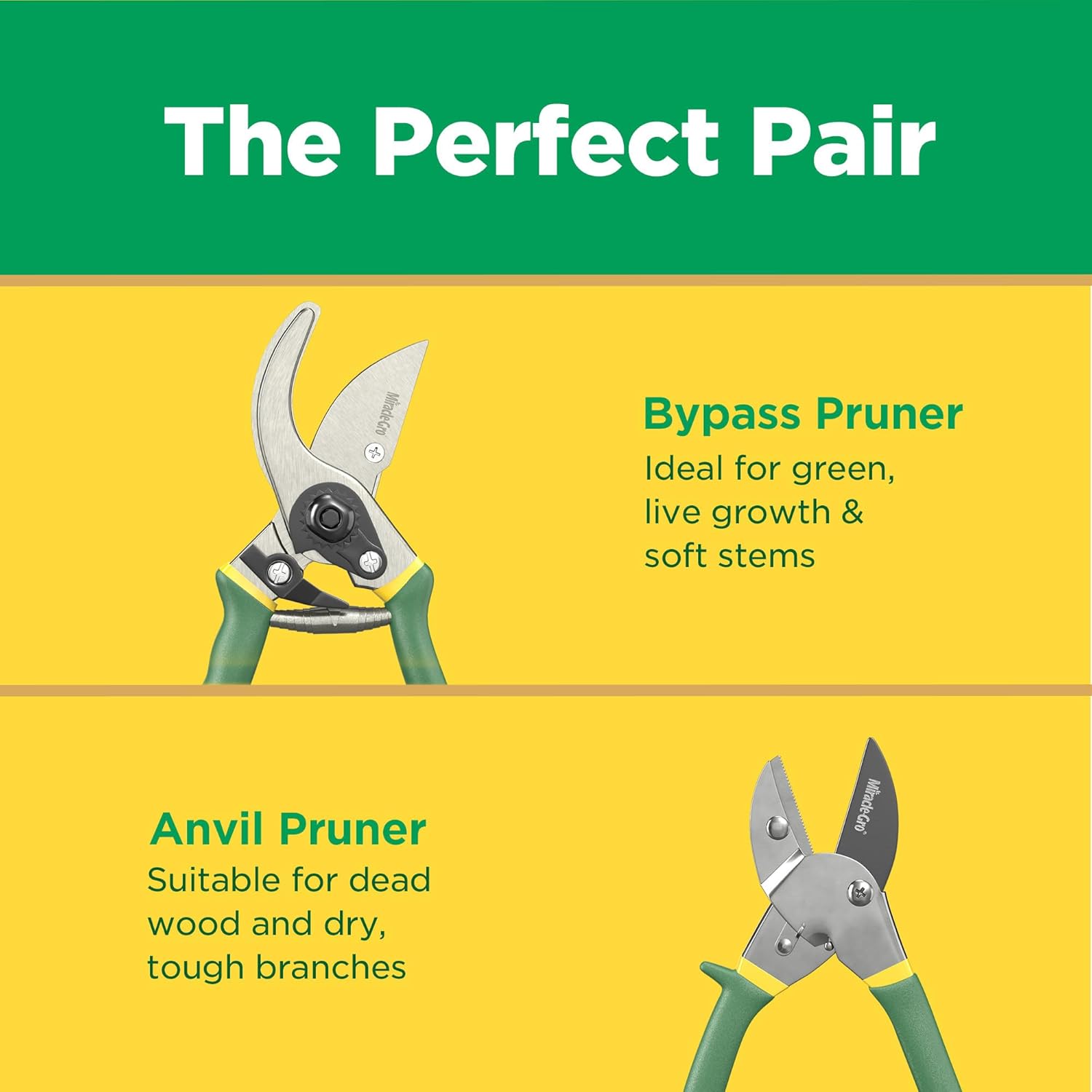 - Versatile 8" Anvil and Bypass Pruners: This set includes both an 8" Anvil Pruner, ideal for dead wood and tough branches, and an 8" Bypass Pruner, perfect for live growth and soft stems.