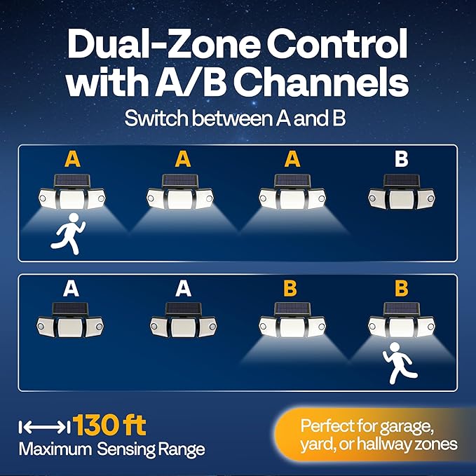 - INDEPENDENT A/B ZONE CONTROL: One slide switch divides lights into A or B modes; When an A-zone sensor triggers, only A-zone lights illuminate (B-zone stays off); Provides precise, energy-saving control for driveways, gardens, and garages. NOTE: For stable linkage, keep units within 130 ft (shorter spacing if obstructed)