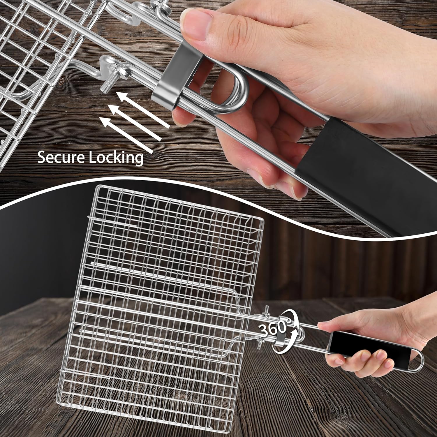 - 【Evenly Roasted】The safety slide buckle on the handle of the grill basket slides up and locks to secure the grill basket cover. You can rotate 360° to make both sides are heated evenly for delicious kebabs